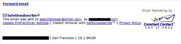This is a screenshot of the actual footer to the message. The mentions of email marketing and unsubscribe options made it seem even more like this was a mass-mailing. The tracking bug is hidden in there too, though I didn’t know it until I checked.