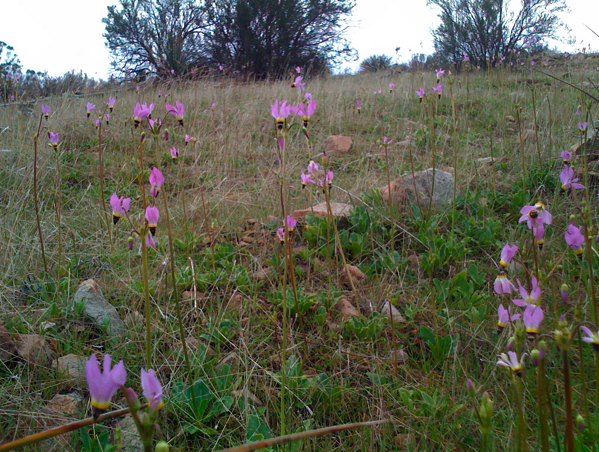 I’ve just got back from a day in the mountains with Liz. We were lucky enough to find a whole meadow full of Shooting Stars near the end of the Mishe Mokwa trail. It was a trail maintenance trip with the SMMTC, so we hiked four miles carrying tools onto the top of the Chamberlain Trail and then spent a few hours working before heading back. We found the flowers on the way back, and it was a real stroke of luck since Liz was already planning on profiling them on the trails council site. Here’s a sneak preview of one of her photos: