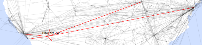 Looking at the network of US cities, it’s been remarkable to see how groups of them form clusters, with strong connections locally but few contacts outside the cluster. For example Columbus, OH and Charleston WV are nearby as the crow flies, but share few connections, with Columbus clearly part of the North, and Charleston tied to the South: