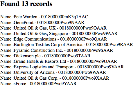 Now point your web browser at the address you uploaded the sample code to. The first time through it should redirect you to a login page on the Salesforce site, ask you whether you want to let the application access your data, and then send you back to the sample code location. If all goes well, you should see a list of your sales accounts: