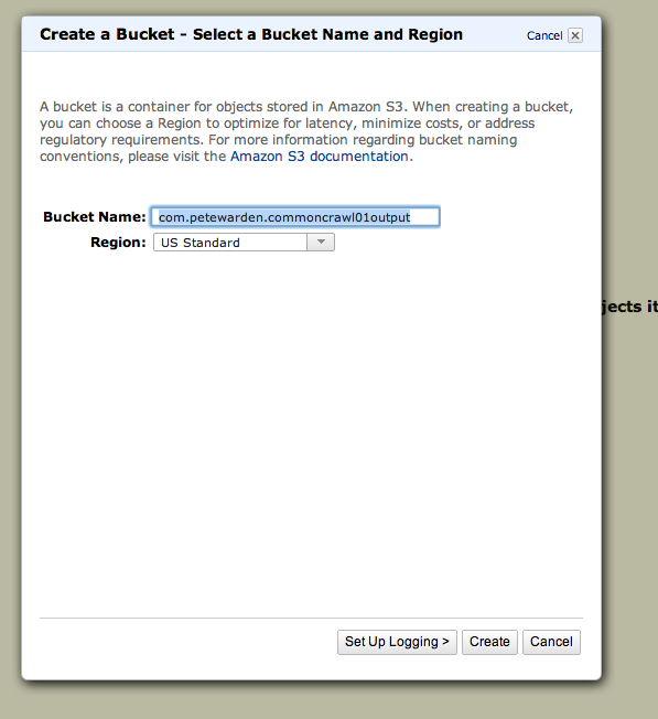 Buckets are a bit like top-level folders in Amazon's S3 storage system. They need to have globally-unique names which don't clash with any other Amazon user's buckets, so when you see me using com.petewarden as a prefix, replace that with something else unique, like your own domain name. Click on the S3 tab at the top of the page and then click the Create Bucket button at the top of the left pane, and enter com.petewarden.commoncrawl01input for the first bucket. Repeat with the following three other buckets: