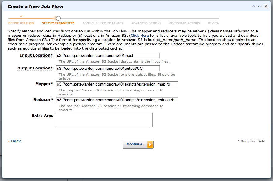 The Mapper and Reducer fields should point at the source code files you uploaded to your 'scripts' bucket, 's3://com.petewarden.commoncrawl01scripts/extension_map.rb' and 's3://com.petewarden.commoncrawl01scripts/extension_map.rb'. You can leave the Extra Args field blank, and click Continue.