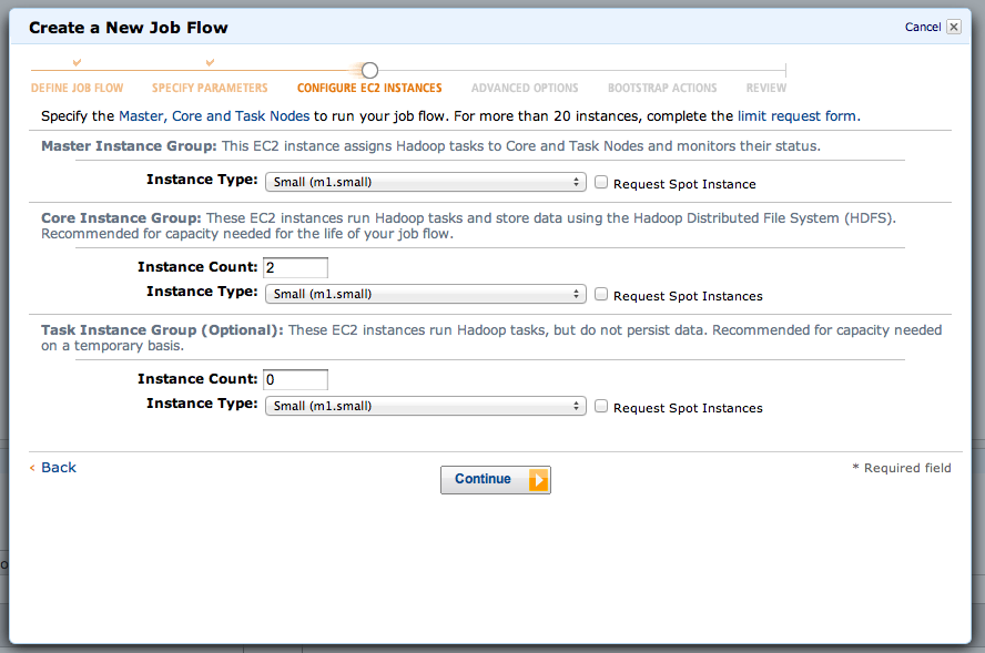 The defaults on this screen should be fine, with m1.small instance types everywhere, two instances in the core group, and zero in the task group. Once you get more advanced, you can experiment with different types and larger numbers, but I've kept the inputs to this example very small, so it should only take twenty minutes on the default three-machine cluster, which will cost you less than 30 cents. Click Continue.