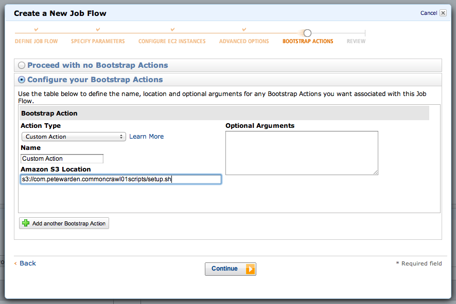 The default virtual machine images Amazon supplies are a bit old, so we need to run a script when we start each machine to install missing software. We do this by selecting the Configure your Bootstrap Actions button, choosing Custom Action for the Action Type, and then putting in the location of the setup.sh file we uploaded, eg 's3://com.petewarden.commoncrawl01scripts/setup.sh'. After you've done that, click Continue.