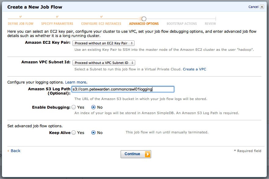Hadoop can be a hard beast to debug, so I always ask Elastic MapReduce to write out copies of the log files to a bucket so I can use them to figure out what went wrong. On this screen, leave everything else at the defaults but put the location of your 'logging' bucket for the Amazon S3 Log Path, in this case 's3://com.petewarden.commoncrawl01logging'. A new folder with a unique name will be created for every job you run, so you can specify the root of your bucket. Click Continue.