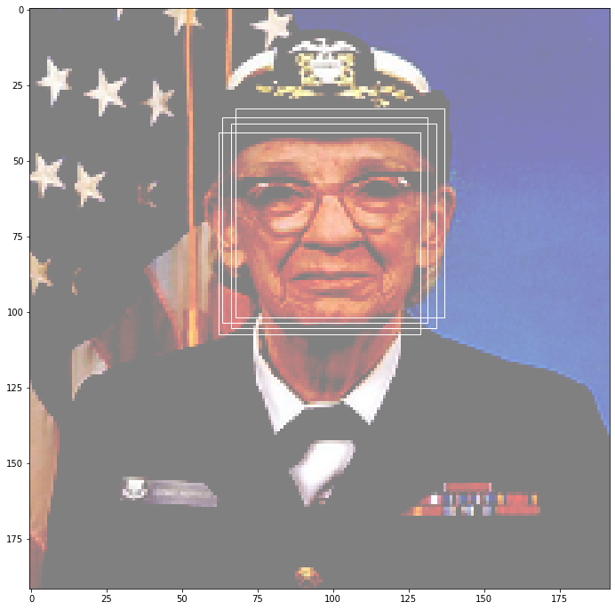 There are two outputs to the model, the first with a shape of (1, 2304, 16), holding 8 pairs of (x, y) coordinates for each anchor. The second is (1, 2304, 1) and holds the score for each anchor. For this model, the first two pairs of coordinates are the origin of the bounding box and its width and height. The other six are the positions of facial landmarks like the mouth or nose. The first stage of decoding is to turn these from relative positions into absolute coordinates by adding the corresponding anchor origins. This gives you a soup of overlapping bounding boxes, each associated with a score.