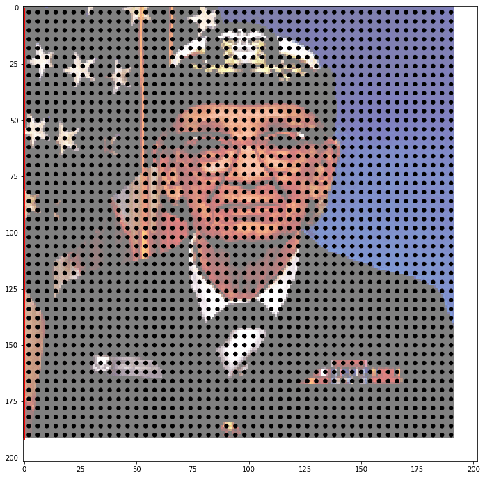 I recommend working through the Colab to get the best understanding, but the summary is that most neural networks designed to produce bounding boxes use a grid of anchor points across the image as a base. Each anchor point is associated with a score value, along with x and y offsets, width, height, and any other feature coordinates (like nose or eye positions). All of these coordinates are output relative to the anchor points, normalized between 0.0 and 1.0, where 1.0 is the image size. There is one score, and one set of coordinates for each anchor point, so in the case of the face model I’m using in the notebook, there are 48 columns and 48 rows of anchors, spread 4 pixels apart on a 192×192 image, which means 2,304 entries.