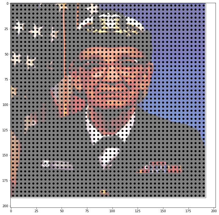 I recommend working through the Colab to get the best understanding, but the summary is that most neural networks designed to produce bounding boxes use a grid of anchor points across the image as a base. Each anchor point is associated with a score value, along with x and y offsets, width, height, and any other feature coordinates (like nose or eye positions). All of these coordinates are output relative to the anchor points, normalized between 0.0 and 1.0, where 1.0 is the image size. There is one score, and one set of coordinates for each anchor point, so in the case of the face model I’m using in the notebook, there are 48 columns and 48 rows of anchors, spread 4 pixels apart on a 192×192 image, which means 2,304 entries.
